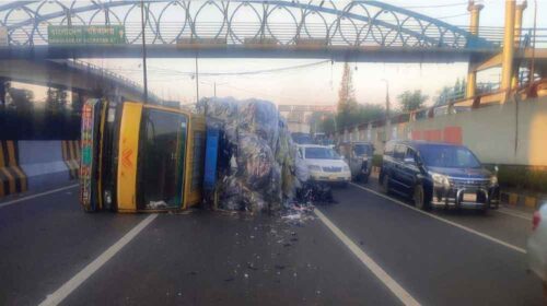 নিকুঞ্জের সামনে ট্রাক উল্টে সড়কে তীব্র যানজট